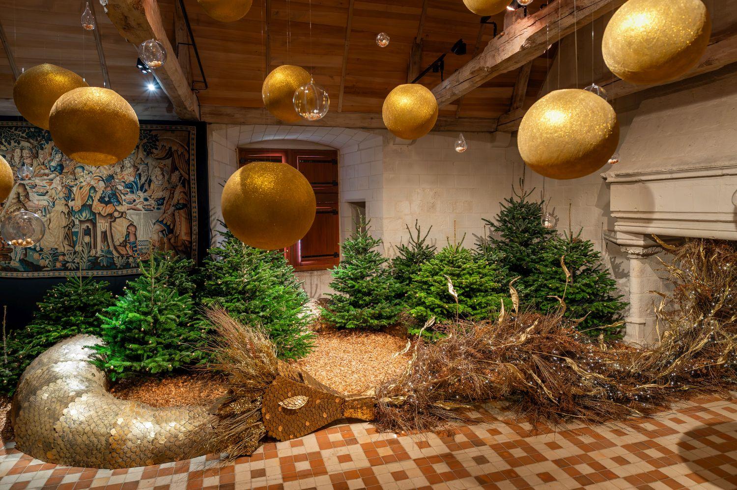Chinon Royal Fortress. - The memory of Henry II Plantagenet, Eleanor of Aquitaine, Richard the Lionheart, Charles VII and Joan of Arc hangs over the royal fortress. For Christmas, the tour revisits the symbols and wonders of our children's treasures. Gold, a symbol of light, power and royalty, gives the visit a special sparkle. Everything shines, sparkles and glitters: the floral creations, tableware, Christmas trees and decorations, and the scenographic plant and floral design created by Géraldine Leclerc of Coach Floral transform Henry II Plantagenet's last refuge into a dreamlike sanctuary.